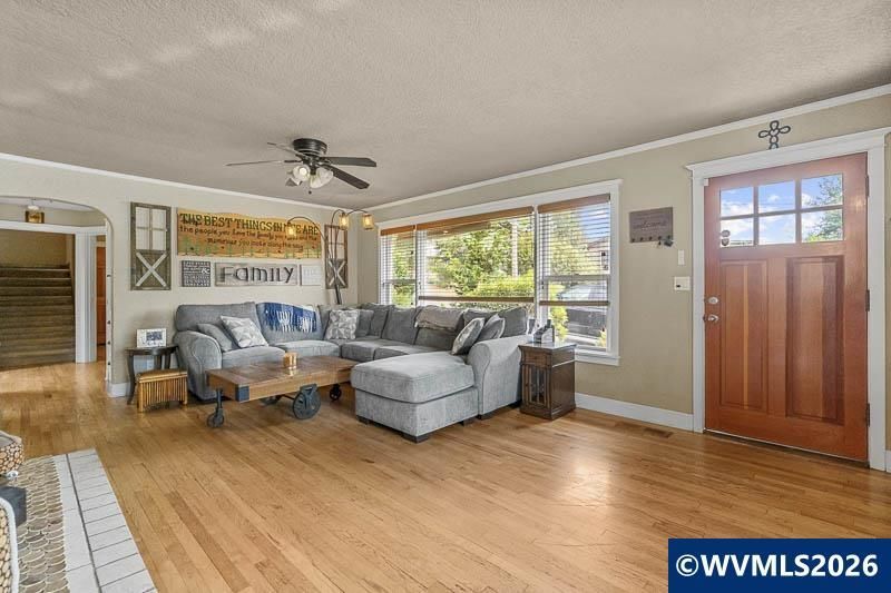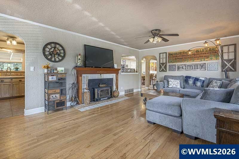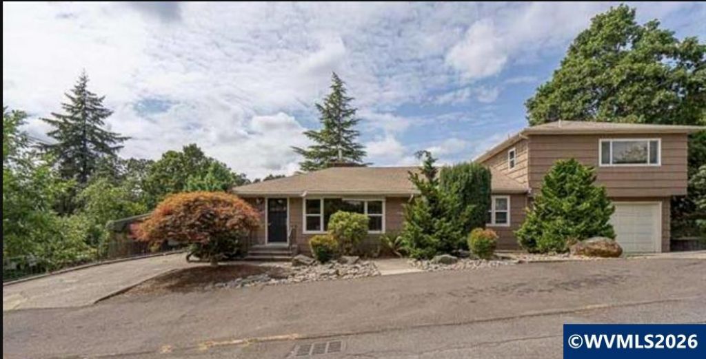 Large corner lot complete w basketball court. Living room has wood floors and fireplace. Kitchen with a lot of counter/cabinet space w/eating bar & adjacent to dining room. Primary bedroom w/ensuite bathroom & second bedroom w/direct access to shared hall bath. Large utility room w/cabinets & sink. Partially finished basement and 4th bedroom off garage. 2 separate garages 1 car and 2 car. Covered patio.