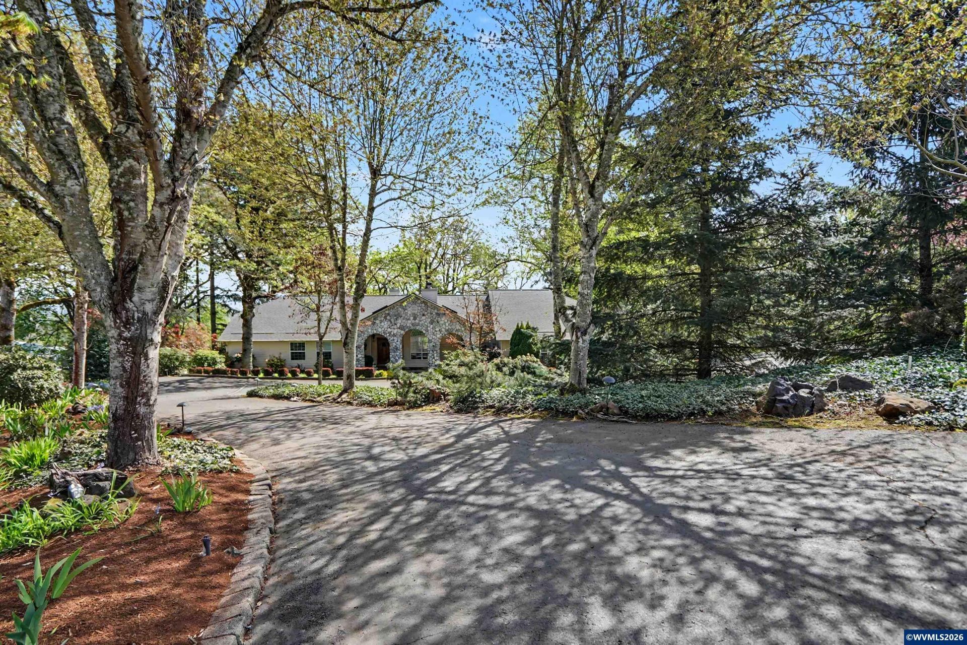 Imagine views of Mt Jefferson and Mt Hood every day! This 2,894 sq ft, 3 bedroom, 2 ½ bath custom retreat on 1.88 private acres is conveniently located to Salem or Albany, offering the peace of country living without sacrificing convenience. The single-level layout flows from a library with fireplace through a generous, well-stocked kitchen and into a family room that opens onto a Trex deck, where the valley and mountains stretch out in a view worth lingering over. The primary suite earns its name: French doors to the views, a two-sided fireplace, three cedar-lined walk-in closets, dual vanities, and a soaking tub. The attached three-car garage handles daily life, but the real surprise is the 40 x 38 carriage house featuring a finished office and half bath, another two-car garage and a 16 x 38 RV bay for bigger ambitions. Upstairs, a second living room, bedroom, and full bathroom offer flexible space, plus an unfinished bonus area, ready for your vision. Paver pathways, a circular driveway, and a sweeping outdoor entertaining terrace complete this standout property.