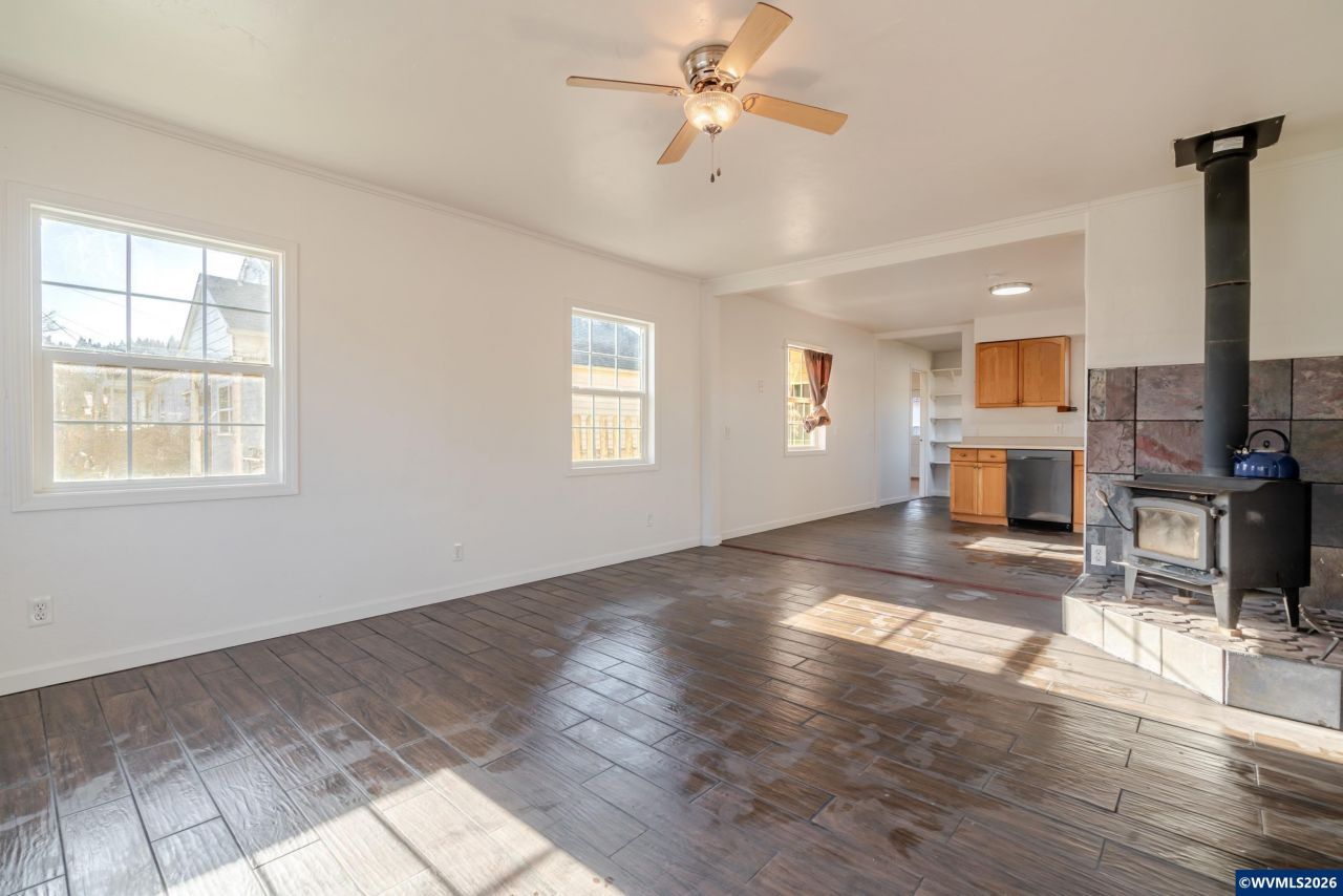 Updated Sweet Home home on a large lot with RV parking, detached garage/shop, and fully fenced backyard. Features include new windows, new exterior doors, cedar siding, newer front porch, updated electrical, and partially updated plumbing. Inside offers tile flooring, bamboo laminate bedrooms, certified wood stove, ceiling fan, and baseboard heat. Spacious primary bedroom with attached bath. Kitchen appliances stay. City water & city sewer. Great space and value!