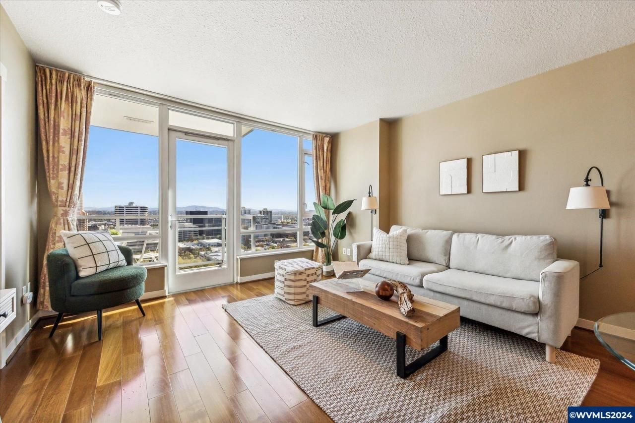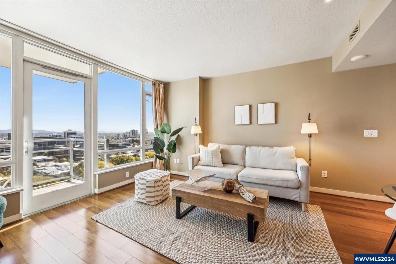 Fantastic price for this view! Private east-facing terrace w/ exceptional 180-degree views of city, mountain range, and bridges spanning the Willamette river. Hardwood floors in interior; kitchen with granite counters & gas range. Washer & dryer inside unit. Common areas include spa, workout room, lounge, & outside area with patio, gas grill, & pet relief area. Deeded parking in covered, secure garage area at base of structure. A wonderful urban home with amazing views!