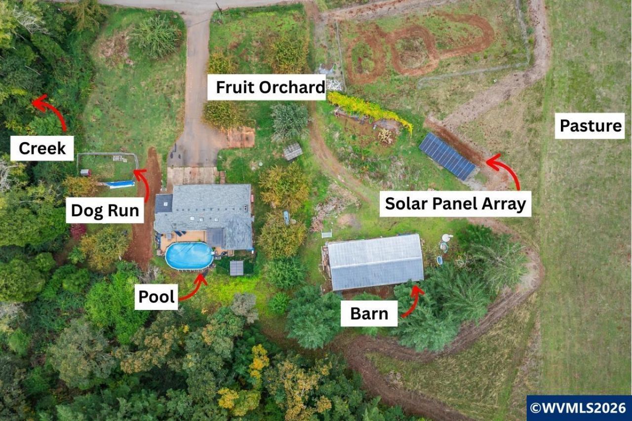 4.21 acres of special agricultural land in one of Salem???s most desirable locations with a recently remodeled 5 bedroom/3 bathroom home with PEX/copper plumbing, updated electrical and new septic system. This gorgeous property also includes an above ground pool with surrounding Timber Tech deck, owned solar panel array to help offset electrical bills, a barn, garden area and large pastures. 4.21 acres of special agriculture land in one of Salem???s most desirable locations in South Salem. The land itself offers privacy and serenity with an artesian well and creek that lines the west end of the property, close proximity to schools, wineries, tree farms and agriculture. Property offers a 5 bedroom/3 bath home with recent additions and two primary suites. A 1966 home with all main systems updated over the last 5 years PEX and copper plumbing, updated electrical panel, septic system and leach field, and exterior paint. True hardwood flooring throughout the upstairs where the first primary suite has vaulted ceilings, full bathroom, and a walk-in closet. Two other cozy bedrooms and a full bathroom are upstairs. A spacious dining room that flows into the updated kitchen with Corian countertops, and crown molding throughout the kitchen and living room. Newer appliances, stainless gas range and dishwasher and plenty of cabinetry for storage. French doors that lead to a Timber Tech decking which runs the length of the home and surrounds an above ground pool. The downstairs has another bedroom and the second large primary suite with a full bathroom (walk-in shower) and lots of closet space. In addition to the main house the property has a barn with electricity; 3 outdoor and 2 indoor bays, a workout room, and finished storage room with attic. The property includes a solar panel array to power the house, barn, and pump house. There is room for parking vehicles, RVs, trailers, and/or boats. A long asphalt driveway lined with fruit trees (apples, cherries, plums, and peaches) welcome you home. Schedule a showing to experience this home and property in person.