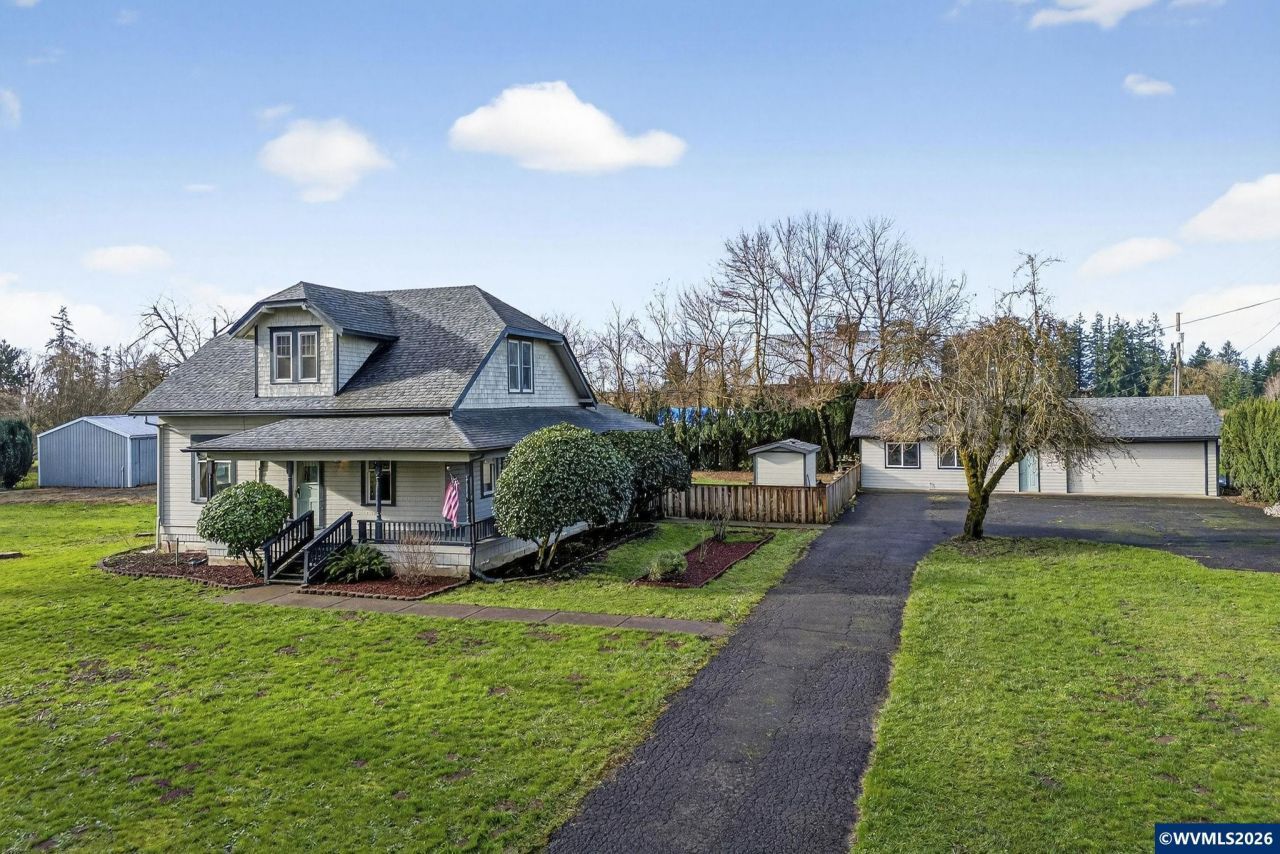 Charming 1915 farmhouse on just under an acre. High ceilings throughout the main floor create a grand feel, w/ beautiful box beams in the dining room & classic built-ins that show quality craftsmanship. Gorgeous well maintained fir floors. Wrap around porch w/ large deck. Fenced backyard & garden space, generator hookup, fiber internet, & natural gas. 20x24 shop w/ 220 power, rv park & detached garage w/ additional flexible living space. Lots of updates. Qualifies for USDA, FHA & VA Loan Options!