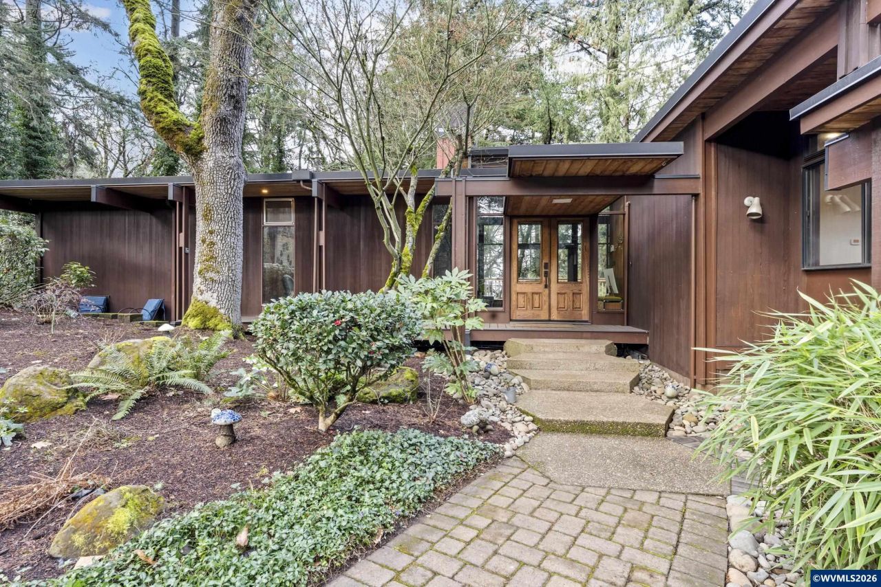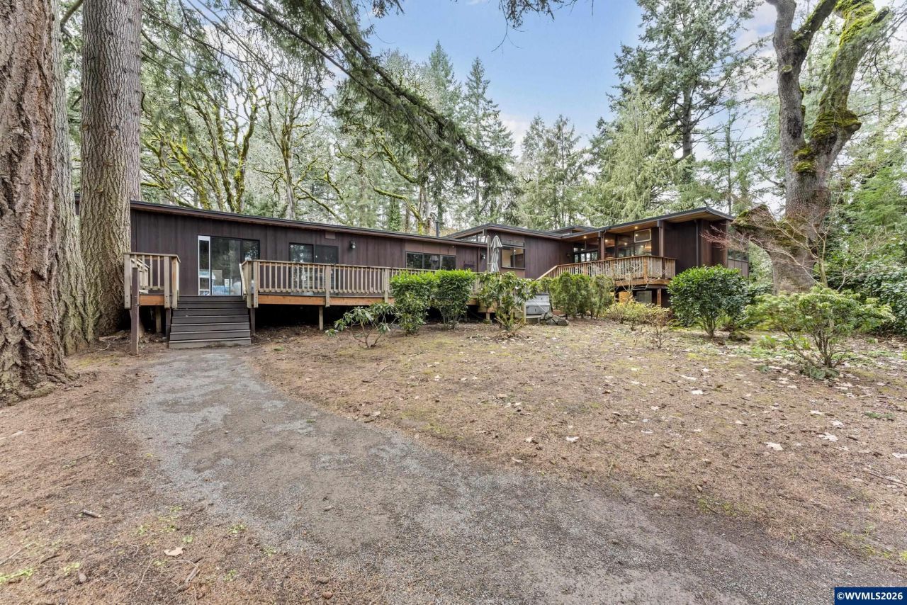 Nestled among the oak trees in the West Salem hills, this updated mid-century modern blends classic architecture with thoughtful improvements. Offering 4 bedrooms plus a dedicated office and high-speed internet, the layout supports flexible living. Main-level primary suite features walk-in closets, private laundry, and an updated bath. Vaulted beamed ceilings and expansive windows fill the living areas with natural light. Remodeled kitchen opens to a new deck, ideal for indoor-outdoor entertaining. Additional updates include remodeled bathrooms, newer roof, hot tub, and newly added RV pad with dedicated holding tank. To view alternate Virtual Tour, please go to 1