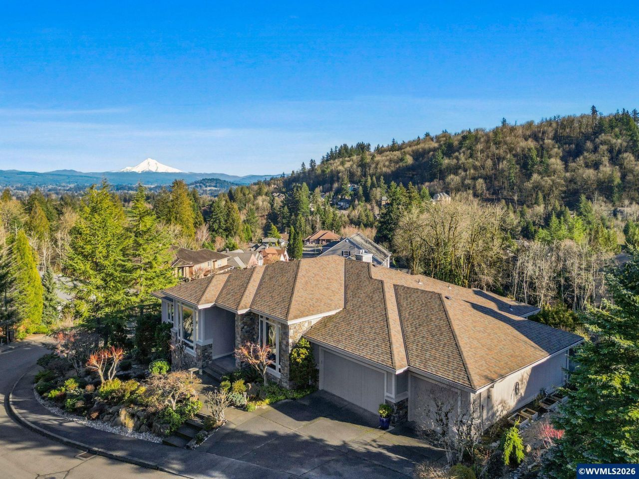 Custom contemporary with Art Deco stylings, perched upon a sloping lot in Persimmon Country Club! Luxury awaits with open, spacious high ceilings, and large windows to showcase the expansive views featuring Mt. Hood. Design elements include Portuguese limestone, Italian travertine, stained glass pocket doors, built-in cabinetry and built-in sound system in many rooms. Granite kitchen with new appliances and an updated island, large office and laundry room. Main level primary bedroom is thoughtfully designed to enjoy the sunrises over Mt. Hood directly from bed! Lower level with 2 more bedrooms, a full bath, media room, potential wine cellar and tons of bonus space. A peaceful patio with Mt. Hood view, a fountain and blueberry bushes.Brand new high efficiency furnace and A/C and topped by a new roof in 2021 and new LVP flooring, this house is ready for you! Enjoy lush outdoor living with amazing views from the east-facing covered deck, relaxing 75' stream and waterfall in a carefully curated landscape design.