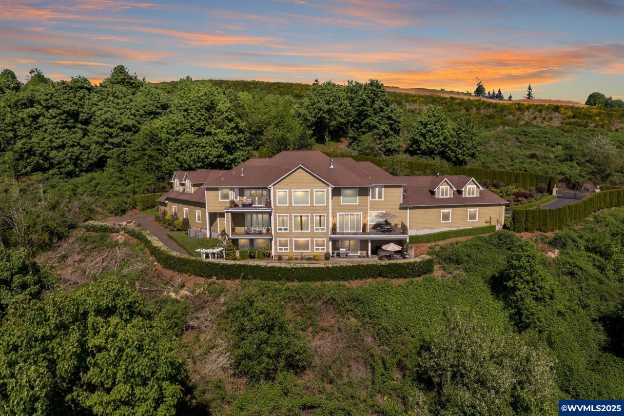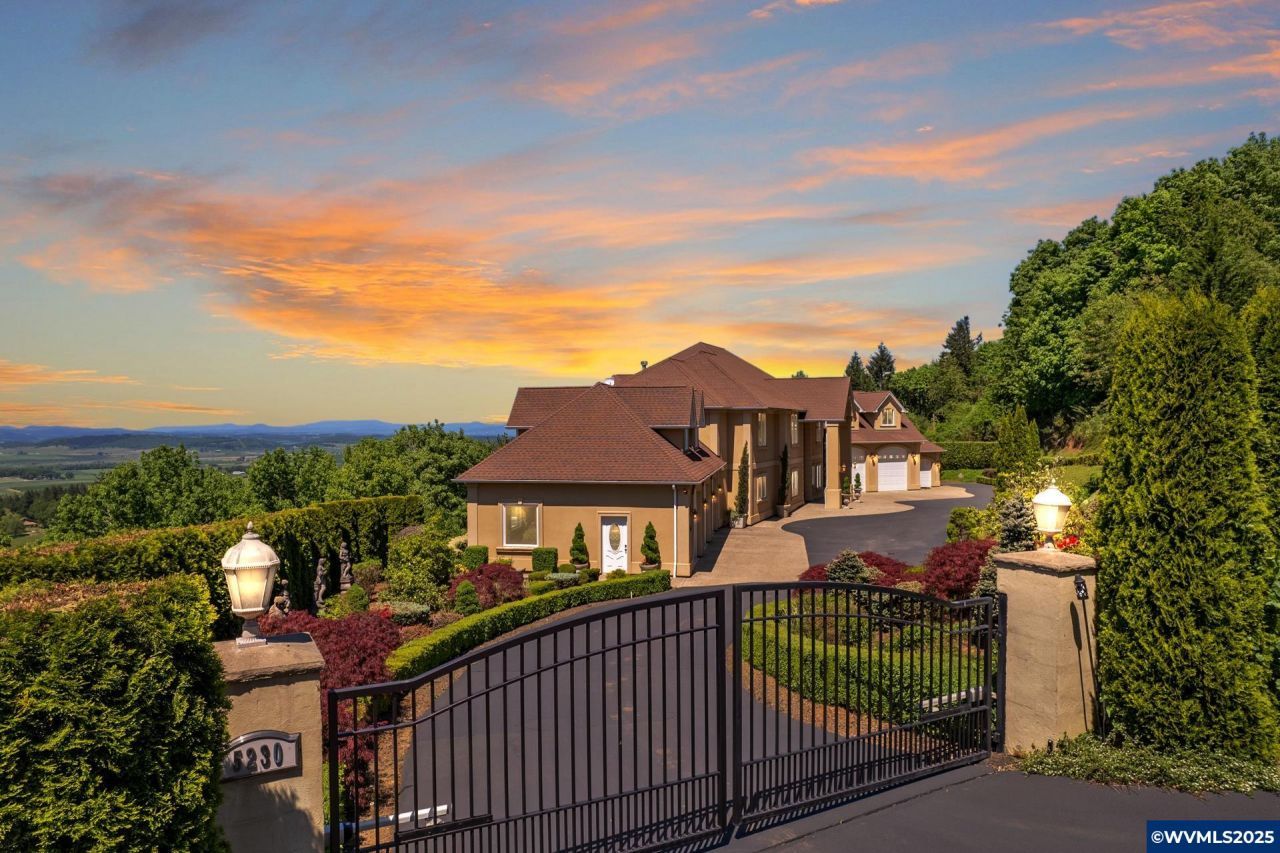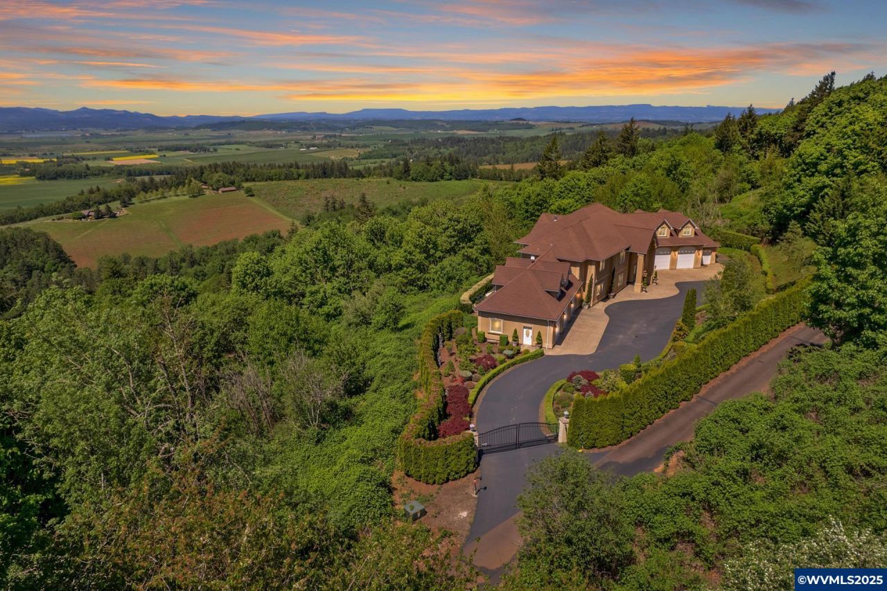 West Salem gated estate with 180 degree vineyard, valley & coastal range views. Featuring Brazilian cherry wood floors, granite counters, custom wood built-in features, hydronic radiant heated floors and top of the line smart home and security features. Offering a spacious yet functional floor plan which includes executive office, gourmet kitchen, formal dining room, media room, gym space, and finished basement with kitchenette. Situated on 4.77 acres and featuring a 6 car garage w/oversized bays for RV.