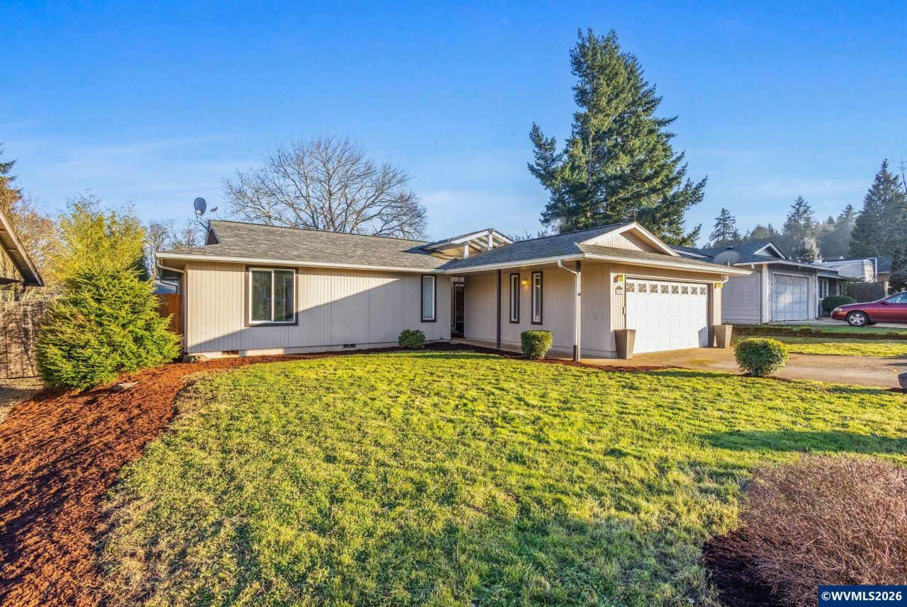Single-level 1,454 sqft home located in a quiet South Salem cul-de-sac. *New roof to be installed prior to conclusion of sale.*. Large, covered walkway leads to entrance with a covered atrium on front deck tucked into the side with its own kitchen entrance. Features include formal and casual dining areas, a covered backyard patio off kitchen, and a spacious living room with fireplace and beamed ceilings. Primary suite offers a walk-in closet. Just down the street from Crossler Middle School and Secor Park. This home really shines at night with great interplay between mid-century modern style windows and exterior lighting. Fully fenced and gated backyard ready for grass seed. Newer drainage system that that connects with gutter system and French drains. Lots of linen closets and a laundry/mudroom with utility sink. The home is perfectly set up to enjoy both back and front yard areas and the atrium compliments the natural flow of the layout. Vinyl windows and sliding doors.