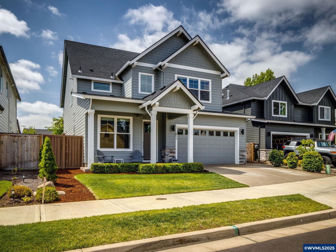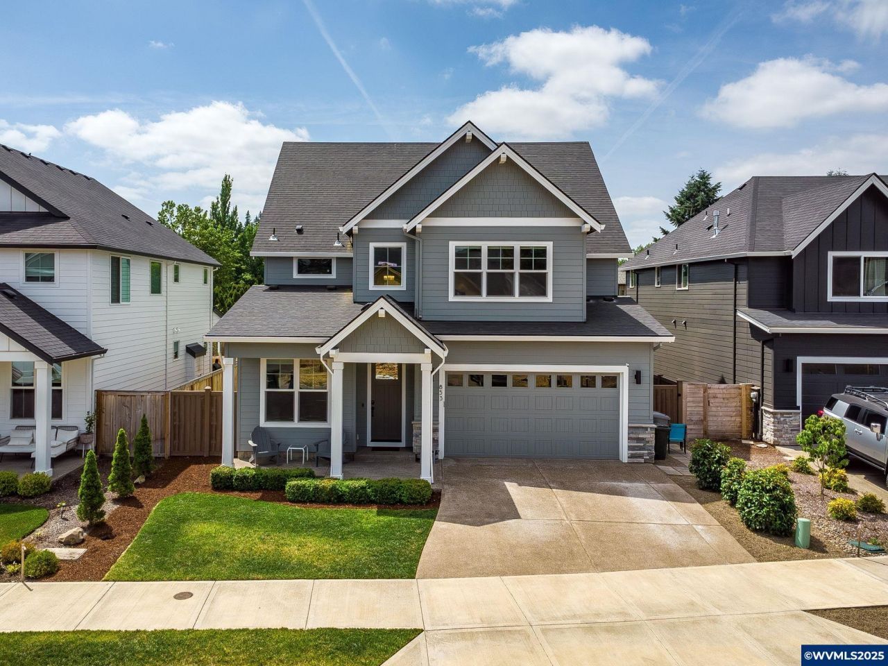 Nearly new! Over 2900SF of spacious living Great room concept with Den/office.Beautiful low maintenance fenced,yard water feature, built in gas firepit, storage shed 12X15 included. Custom window blinds, SS appliance, coffee bar, pantry, quartz counters. island and large nook. Gas fireplace in great room, laminate floors on main level.Huge primary bedroom and luxurious bath suite and WIC. Upper level laundry and 2 bedrooms. Central Air. Located in the heart of Canby walking distance to parks. Call or text LA for 24 hr appointment.