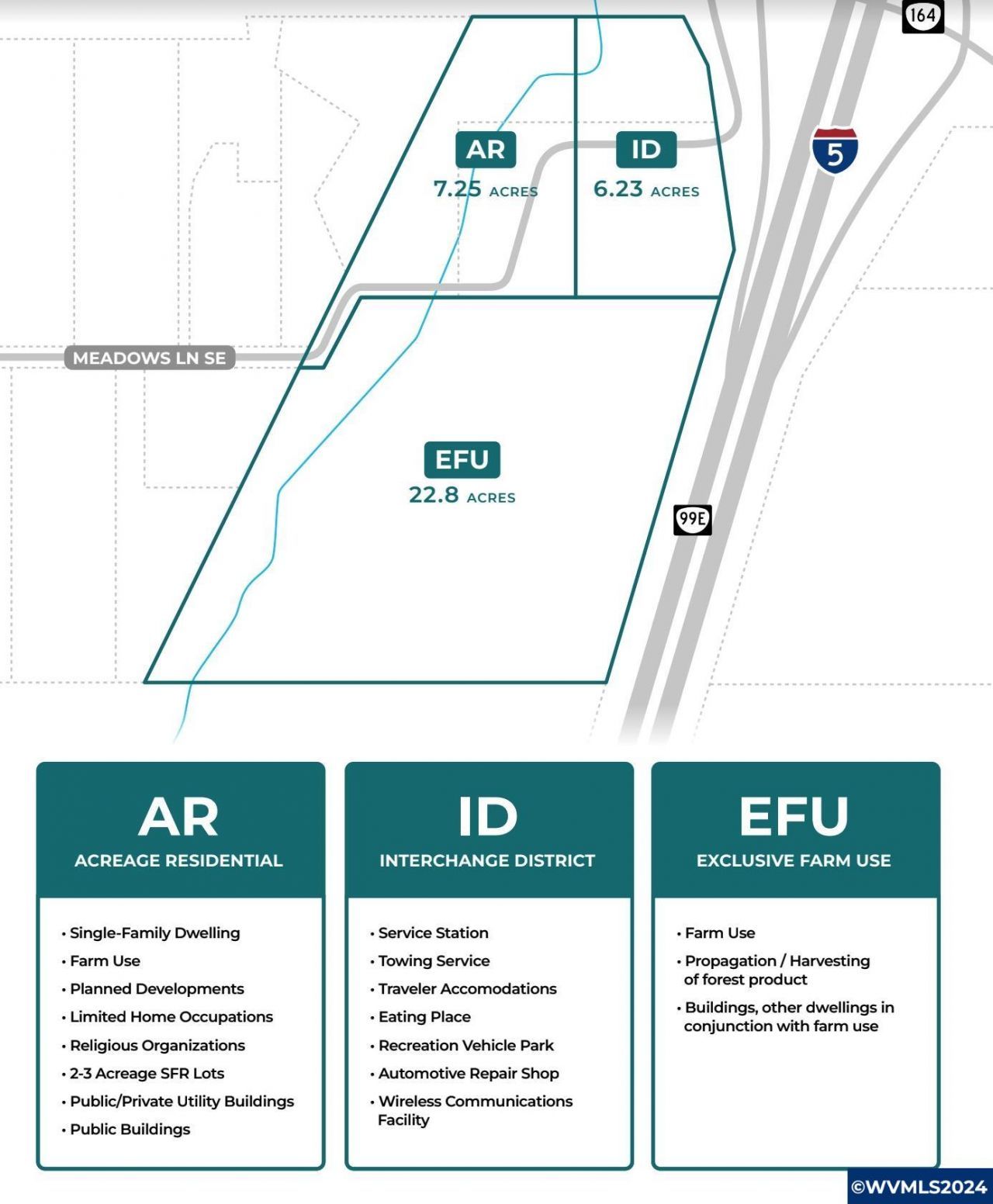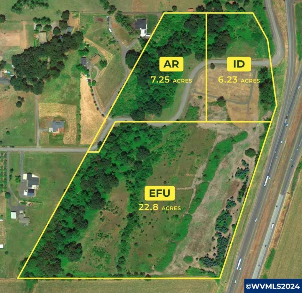 Two parcels make up a total of 36.38 acres in Jefferson, OR. Highly visible location directly off I-5 Interchange exit 244 just 13 miles South of Salem and 16 miles North of Albany. Of the total acreage there are three zoning codes: AR (Acreage Residential) - approx 7.25 acres, ID (Interchange District) approx. 6.23 Ac, and EFU (Exclusive Farm Use) approx. 23 acres. There are several permitted uses within these zones including single family homes, traveler accommodations such as RV parks, gas stations, etc.